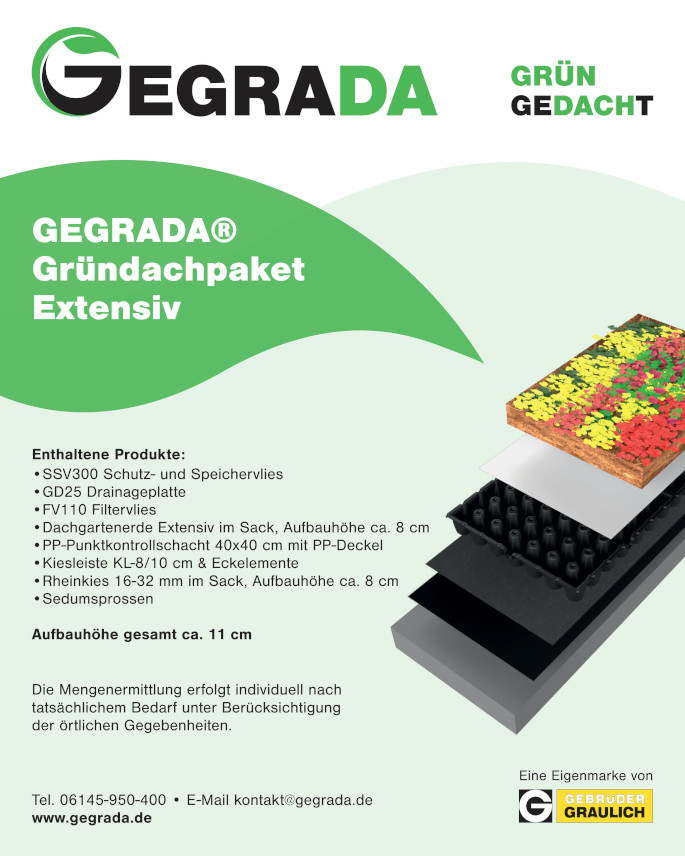 Unser GEGRADA® Gründachpaket Extensiv ist die ideale Lösung für alle, die mit minimalem Pflegeaufwand ein ökologisches Plus auf dem Dach schaffen möchten. Die Aufbauhöhe von ca. 11 cm eignet sich perfekt für Dächer mit geringerer Traglast.